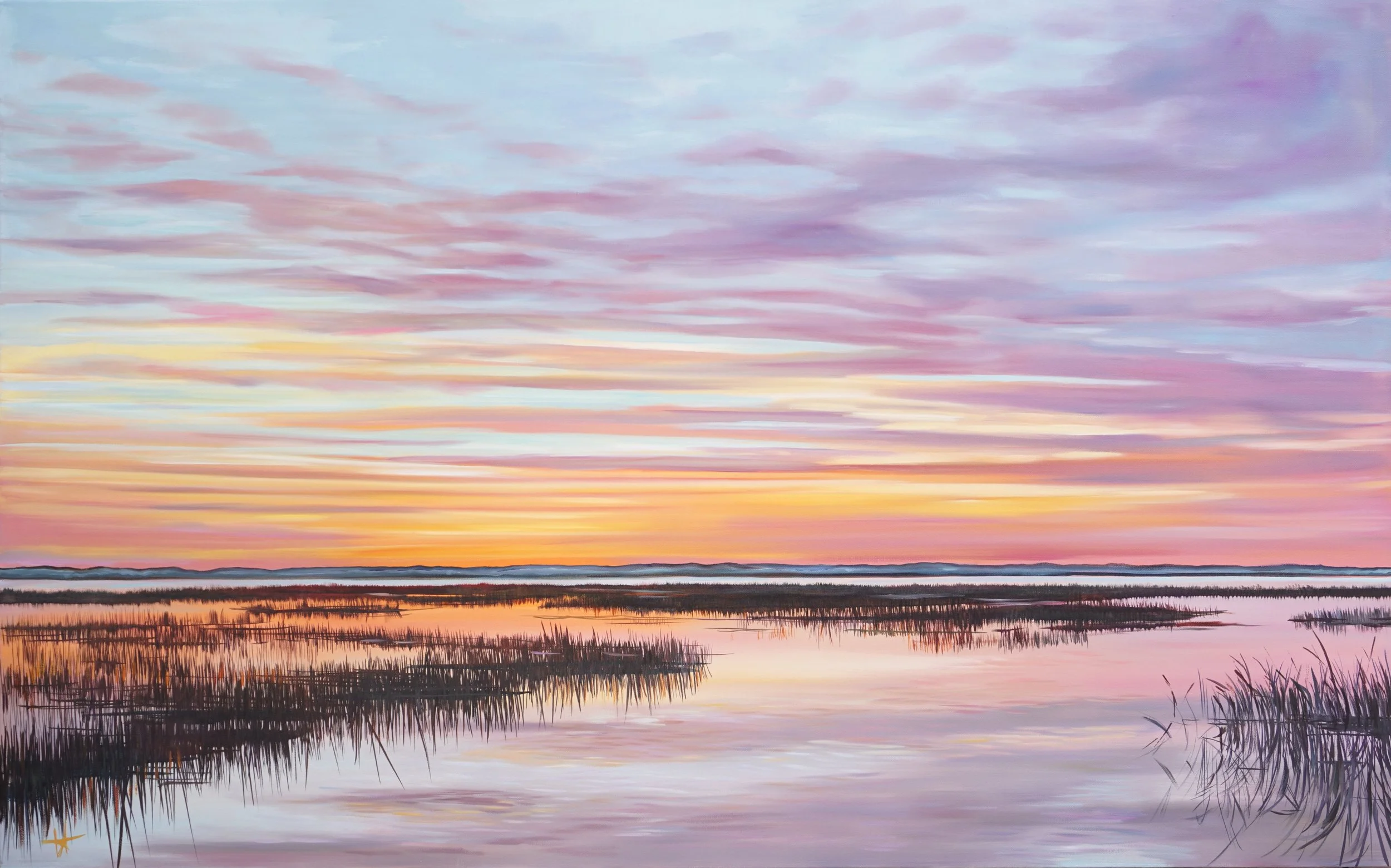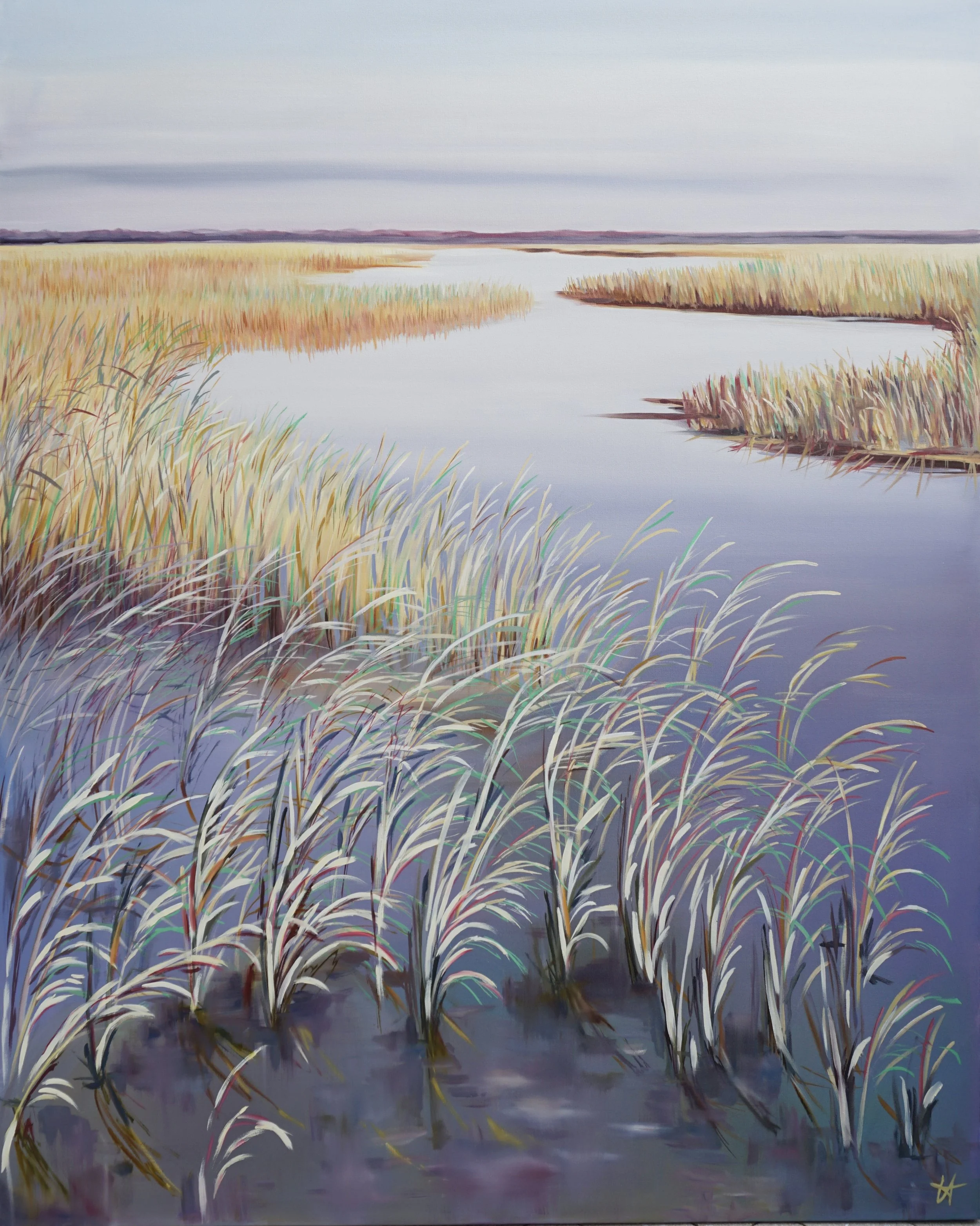 The Lowcountry landscape offers no shortage of inspiring subjects for painting; however, it is my belief and experience that even the exact same view can provide infinite source material. From the expansive marsh views of my neighborhood dock to the shorelines of the Charleston beaches, my daily walks are a regular connection to nature and my work where I attempt to quiet my mind, but my eyes are too busy eagerly seeking the composition set forth before me. My love for the marshes grasses are especially translated in my paintings; no matter how many times I see the sun hit the reed tips, it’s truly like I’m discovering a new feature within the wetlands. Each day and each hour brings forth a new variable that affects the colors on display: the tide, the time, the cloud cover, the season, the wind. It is my goal that I paint my sincere reverence and love of our landscape as the beautiful, wonderful gift we all share: how truly fortunate we are to have the ability to access both art and nature so freely in the Lowcountry.